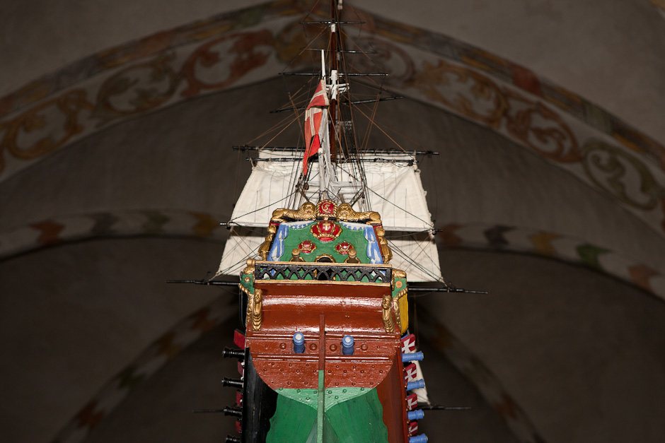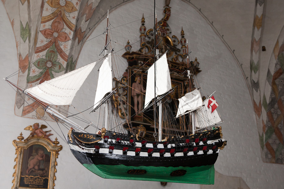 Kirkeskibet er udført som en nøjagtig model af datidens orlogsskibe. Det er malet rød på den ene side og sort på den anden. Den røde farve anses for at være den originale. Den sorte farve med de hvide bånd er en senere ændring, der er blevet til efter indflydelse fra de orlogsskibe, den engelske admiral Nelson anvendte, da han i 1801 stjal den danske flåde.