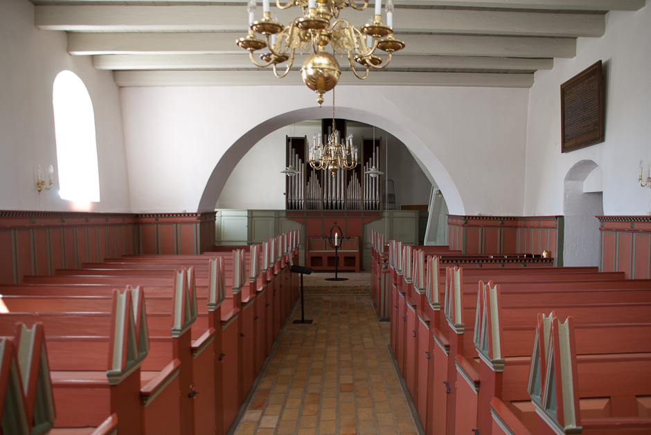 Bænke og vægpaneler er fra 1600-25. Bænkene har dobbelte trekantgavle. Orglet står i tårnrummet, der er forbundet med skibet med en bred bue.