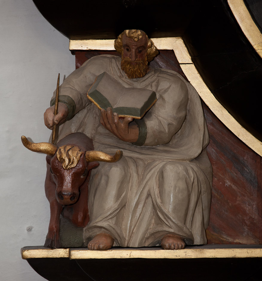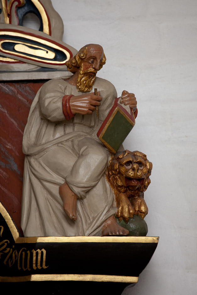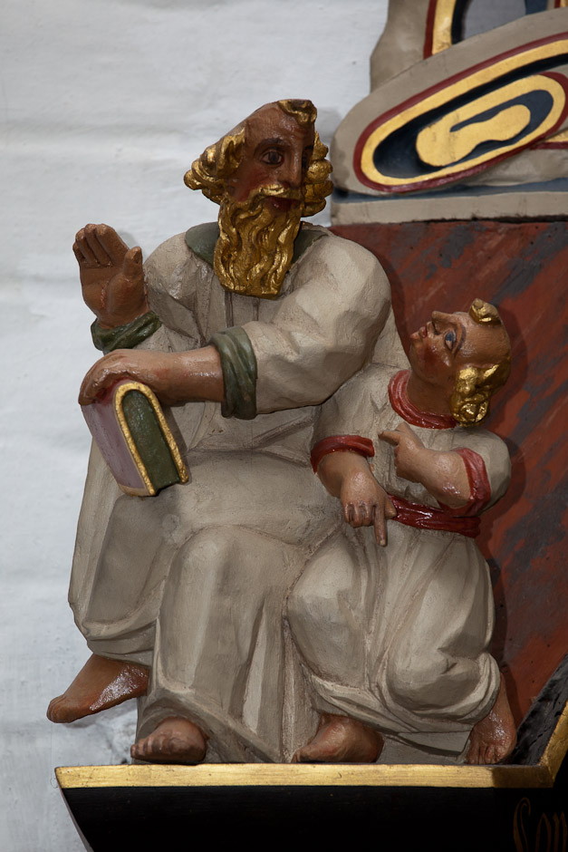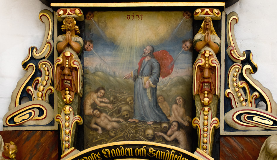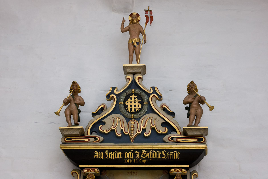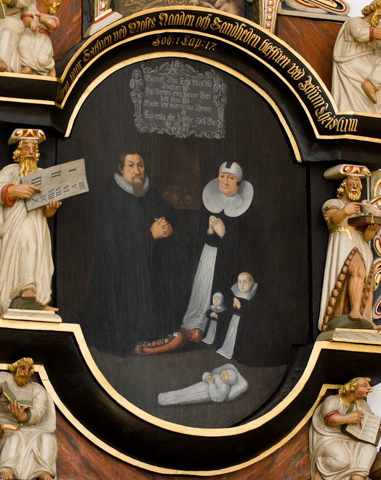 Epitafium på korets nordvæg til minde om præsten Melchior Evertsen Meier 1648-55. Man ser præsten og hans hustru samt deres to levende børn. Et barn, som de har mistet, er også malet - i ligtøj.