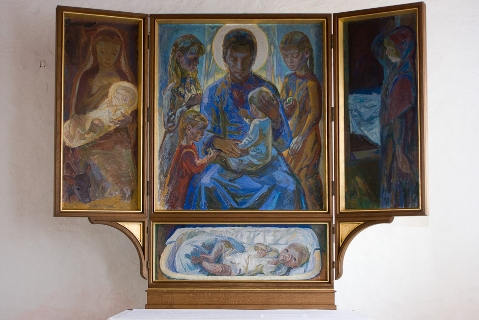 Altertavlen er en fløjtavle fra 1950 tegnet af Leopold Teschl med malerier af Poul Høm. Poul Høm har også malet altertavlen i Albæk kirke.