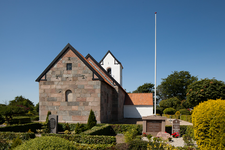 Skib og kor er romanske, mens våbenhus og tårn er senere tilføjelser.