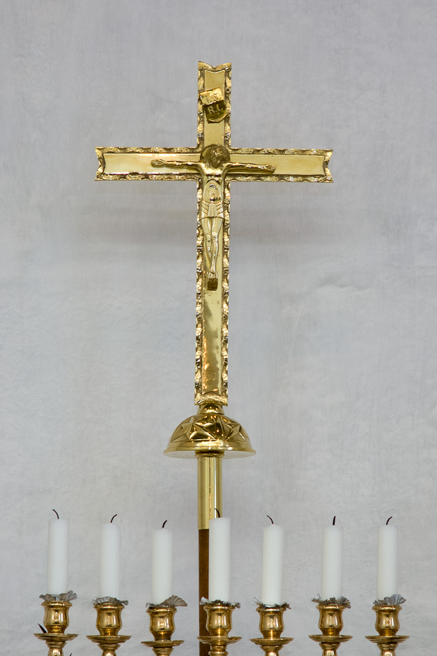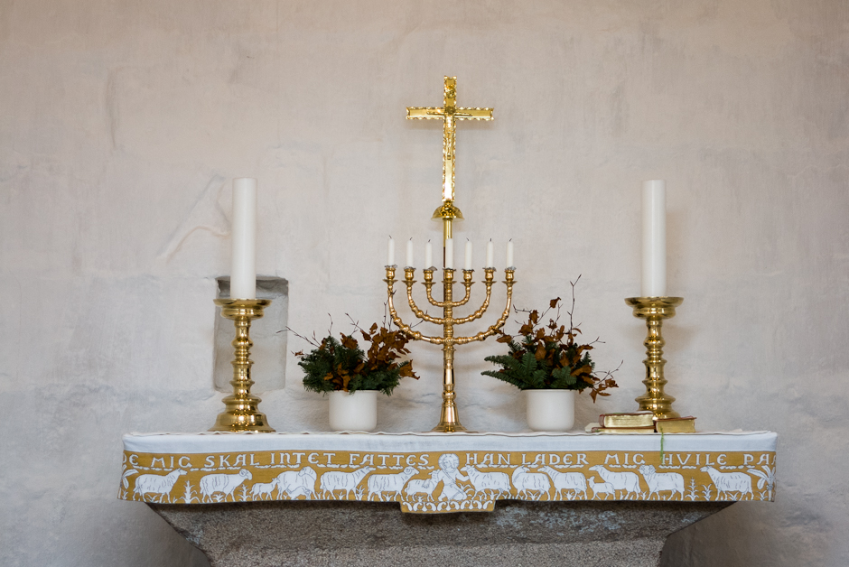 Det romanske alterbord har en stor granitstenplade med skråkant til bordplade. Den indeholder en (tom) helgengrav.