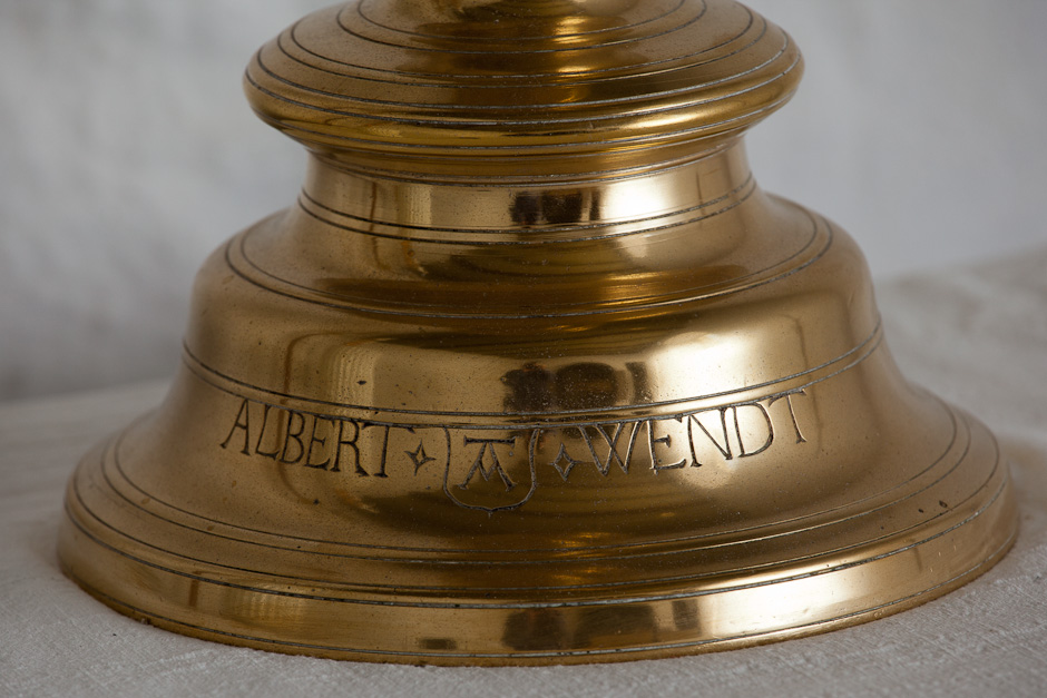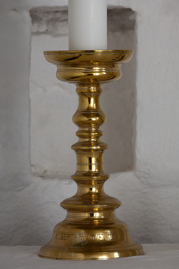 Alterstagerne er beslægtet med alterstagerne i Frøslev fra 1585. De bærer indskriften: »Albert Wendt« Det er den samme Albert Vind til Ullerup, der bekostede altertavlen i 1584.