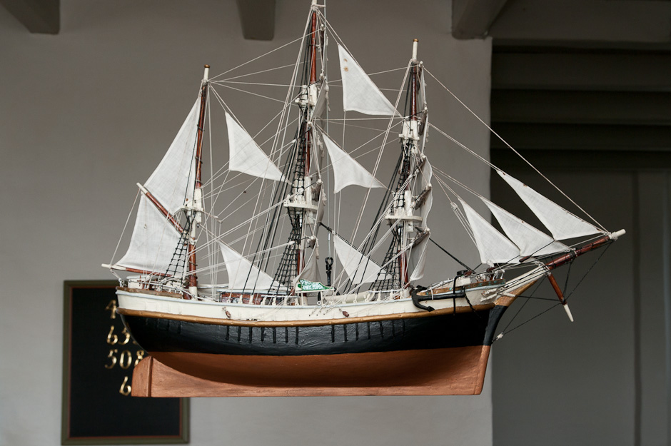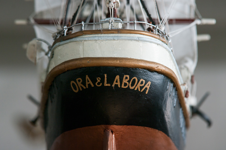 Tremastet bark »Ora et labora« fra 1907. Skibet er skænket af fisker Johannes Damsgaard, der også har lavet det. Johannes Damsgaard har også lavet kirkeskibene i