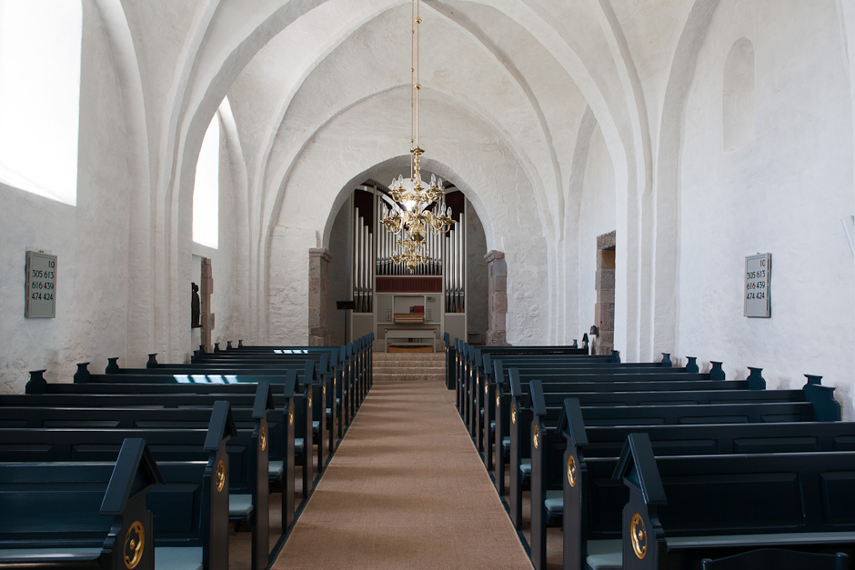 Hvælvene er sengotiske. Korbuen er bevaret. Kragstenene har profiler på undersiden. Kirkens indre har fået sit nuværende præg efter en restaurering i 1937 udført af arkitekt E. Packness.