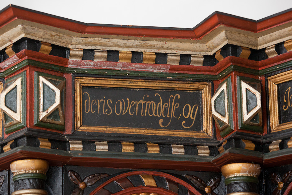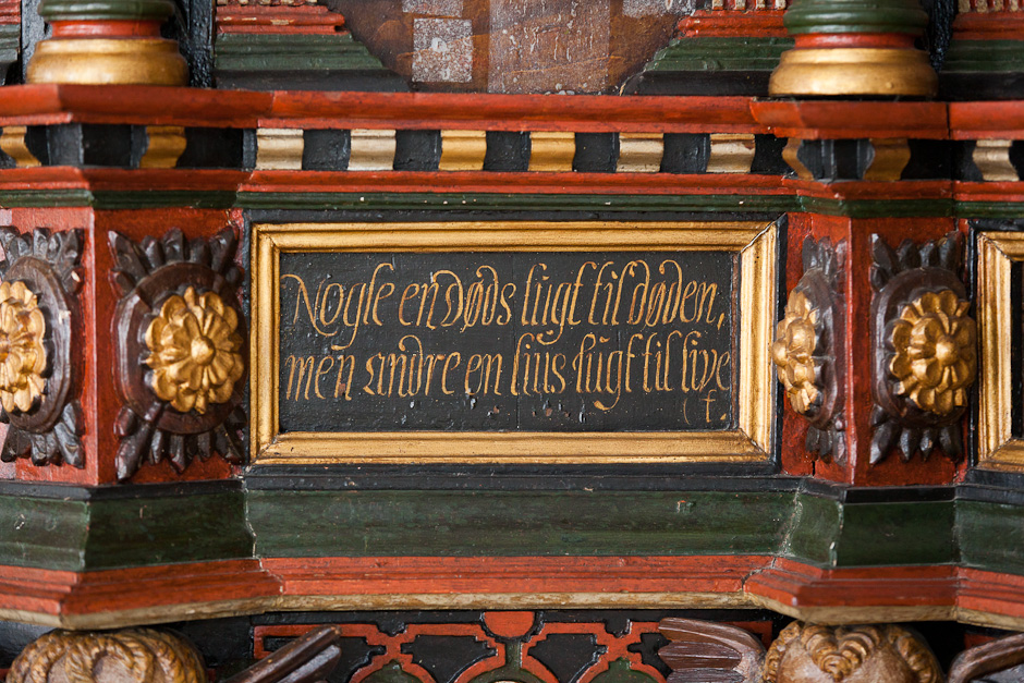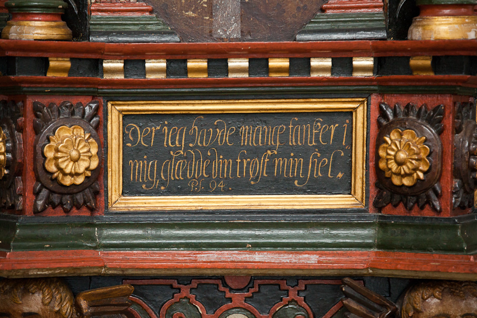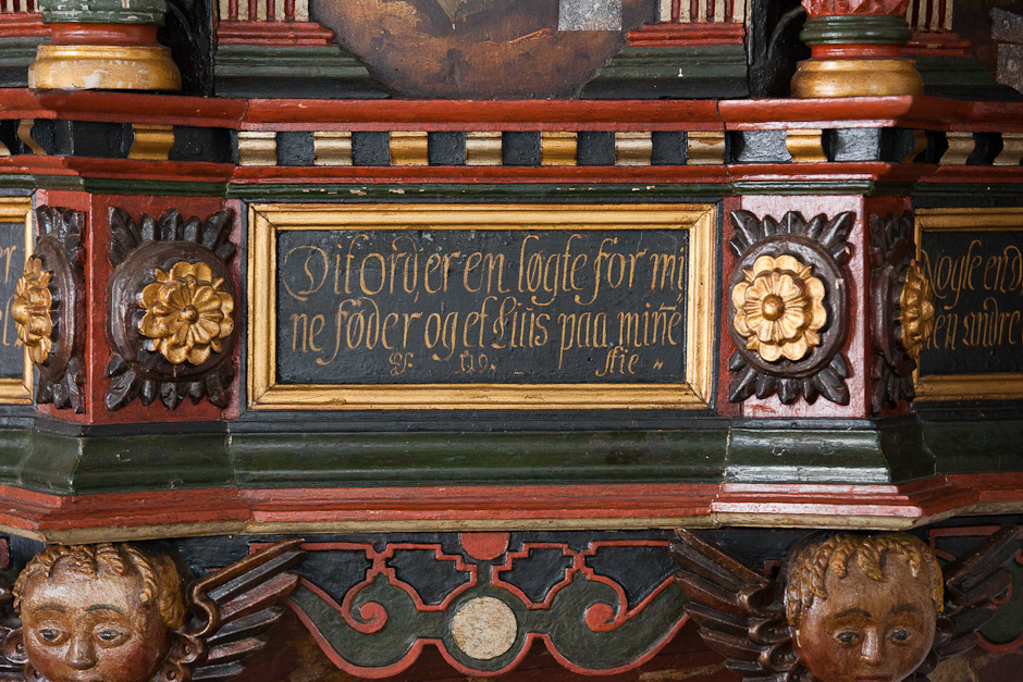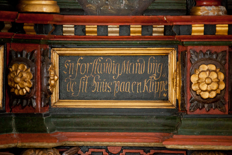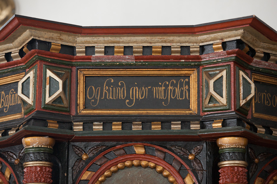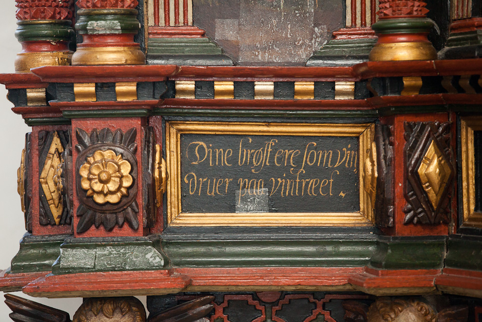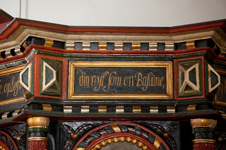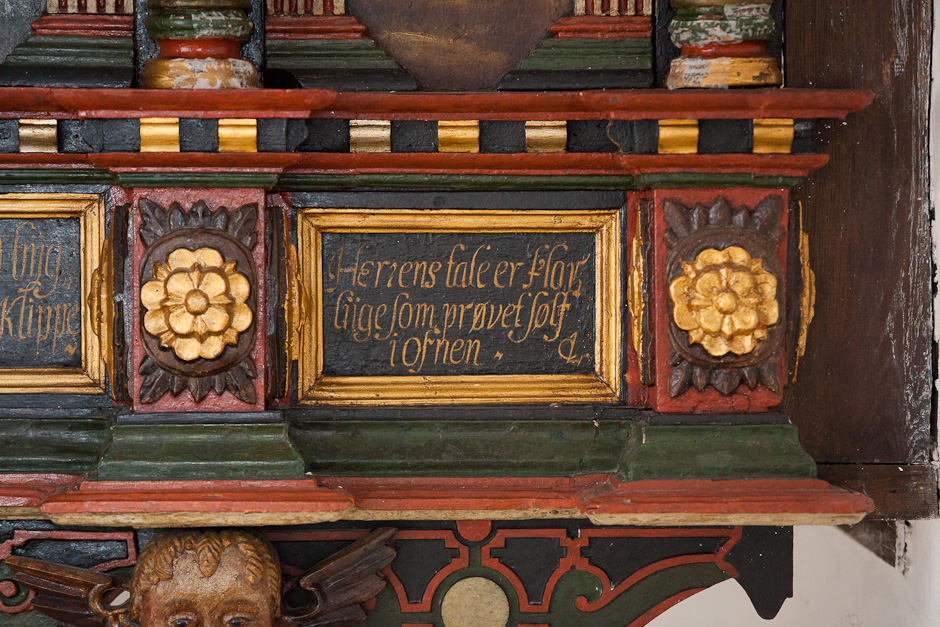 Gesimsfelterne læses fortløbende. Det er et citat af Es. 58,1: »Raab af struben, spar icke, opløft din røst som en Basune, og kundgiør mit folck deris overtrædelse, og Jacobs Huus deris synder. Esa. 58«