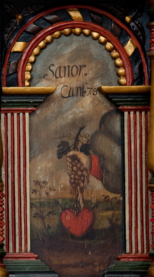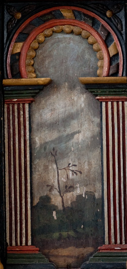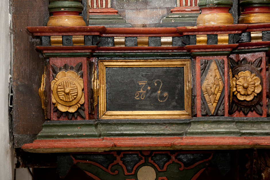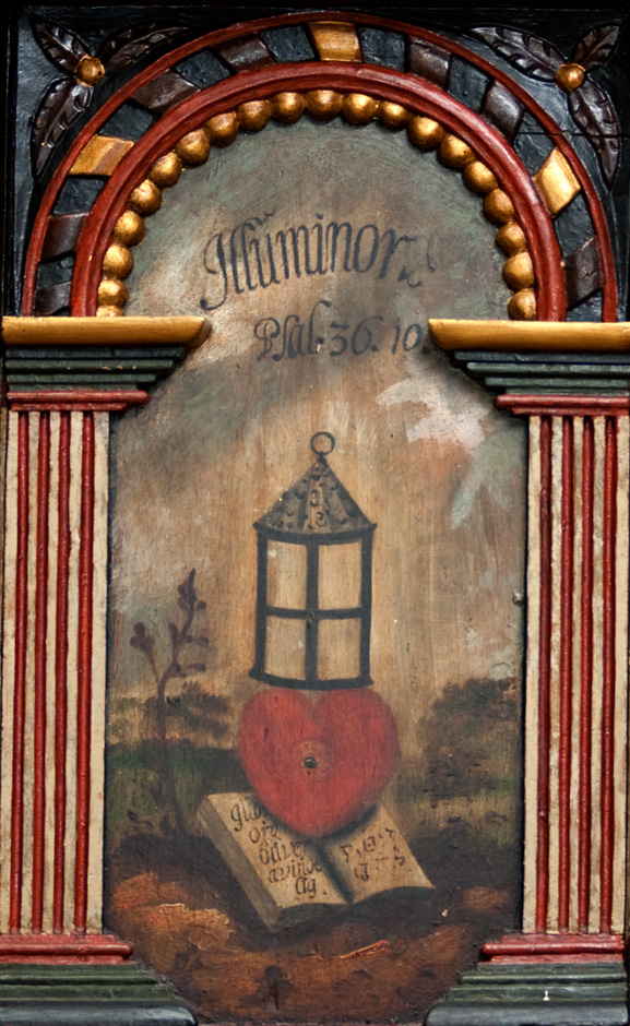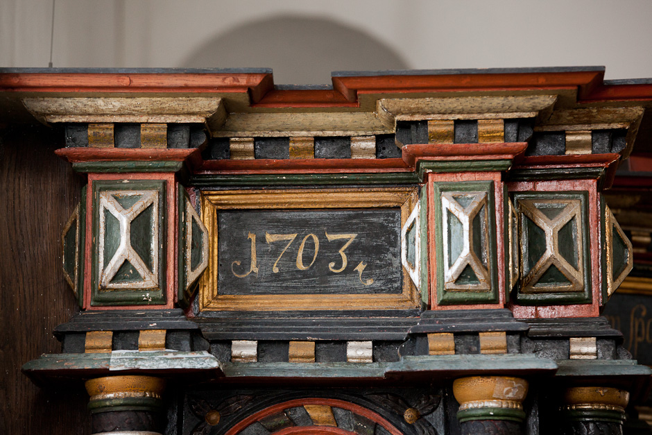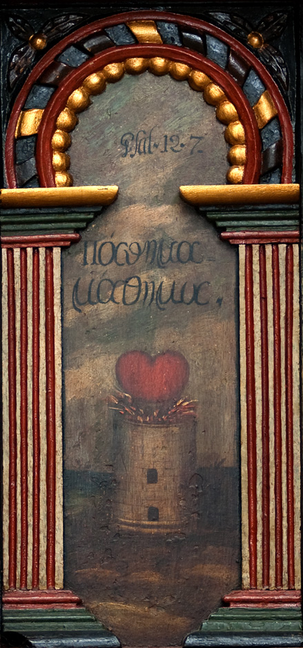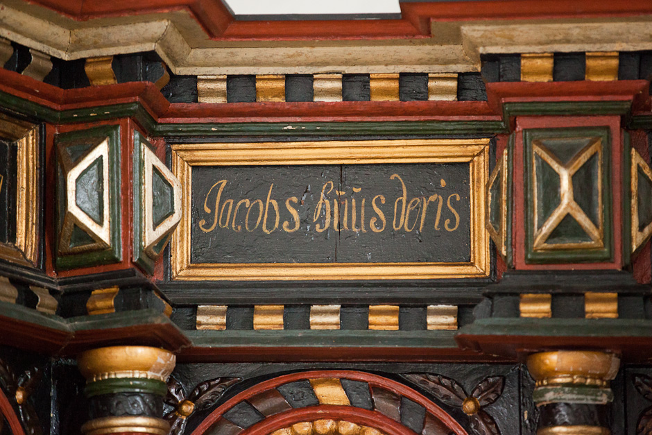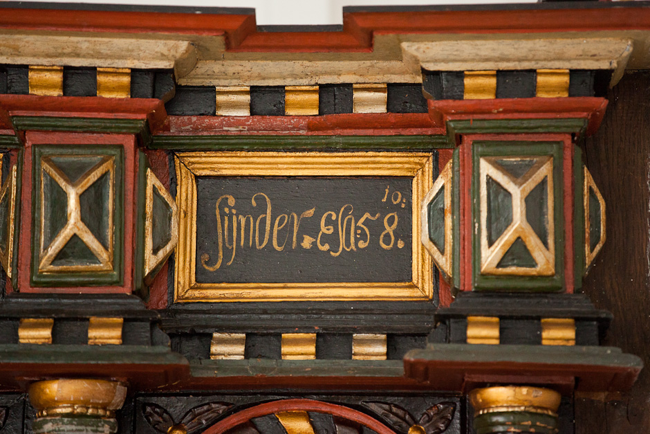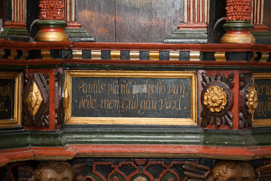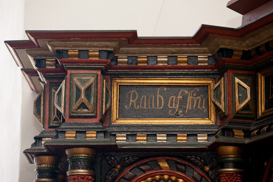 Gesimsfelterne læses fortløbende. Det er et citat af Es. 58,1: »Raab af struben, spar icke, opløft din røst som en Basune, og kundgiør mit folck deris overtrædelse, og Jacobs Huus deris synder. Esa. 58«