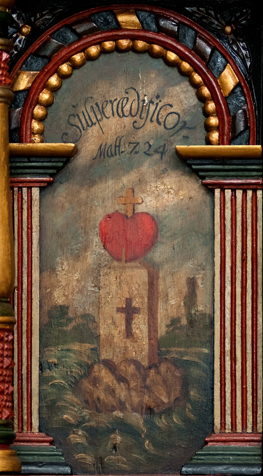 Klippe omskyllet af vand; på klippen et korsmærket hus med hjerte og kors på toppen. Indskrift: Superædifico (jeg bygger ovenpå).