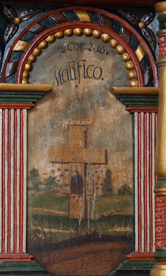 Kors med bikube. Indskrift: Mellifico (jeg forsøder).